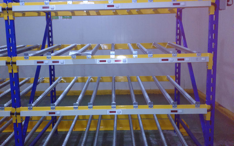 - Shelves are sloped with “interroll” roller beds enabling goods to move by the force of gravity.